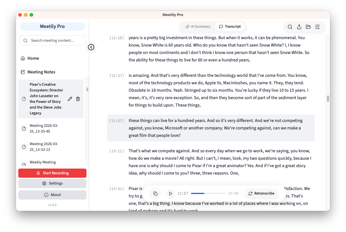 Meetily transcribes audio locally using AI models on your device. Review your transcript, get AI-generated summaries, and export notes - all without leaving your machine.